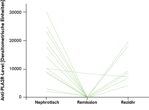 Doch trotz des offensichtlichen Zusammenhangs sollte der Anti-PLA2R-Titer als immunologischer Marker differenziert von der Proteinurie betrachtet werden, die als klinischer Marker fungiert. Aufgrund der Chronologie der Ereignisse in der bislang beschriebenen pMN-Pathogenese ist anzunehmen, dass die Marker im Krankheitsverlauf zwar ähnlich, aber zeitlich versetzt reagieren.5