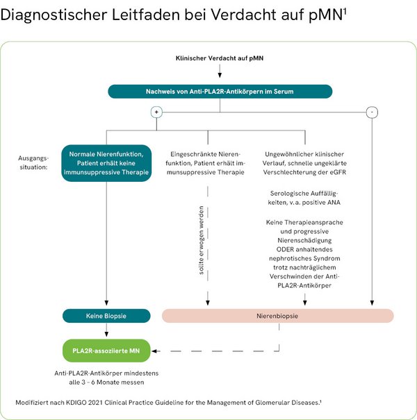 In Abhängigkeit vom Verlauf und Schweregrad der Erkrankung wird in der neuen globalen Leitlinie der KDIGO mittlerweile ein differenziertes Vorgehen in der pMN-Diagnostik empfohlen. Denn durch den Nachweis von Anti-PLA2R-Antikörpern kann die Diagnose einer pMN ausreichend eindeutig belegt werden, dass in den meisten Fällen eine Biopsie vermeidbar ist (siehe Abbildung).1 Der serologische Diagnostik-Ansatz, für dessen Durchführung lediglich eine Blutprobe notwendig ist, stellt somit eine nicht invasive Alternative zur Biopsie dar.